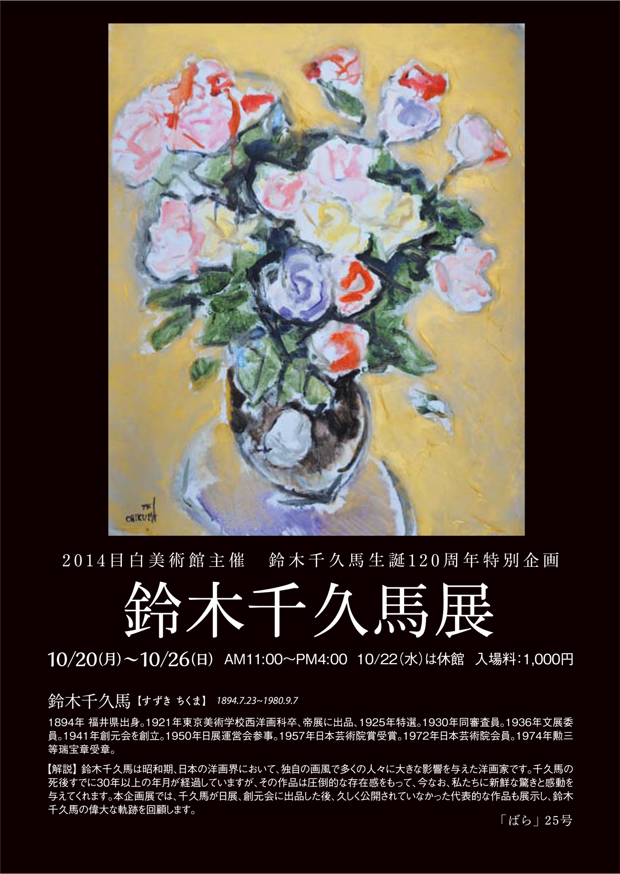 2019.7.4 2014目白美術館主催 鈴木千久馬生誕120周年特別企画 鈴木千久馬展 鈴木千久馬(1894-1980)は昭和期、日本の洋画界において、独自の画風で多くの人々に大きな影響を与えた洋画家です。 千久馬の死後すでに30年以上の年月が経過していますが、その作品は圧倒的な存在感をもって、今なお、私たちに新鮮な驚きと感動を与えてくれます。本企画展では、千久馬が日展、創元会に出品した後、久しく公開されていなかった代表的な作品も展示し、鈴木千久馬の偉大な軌跡を回顧します。